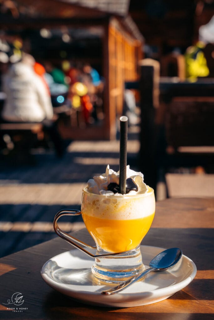 A winter trip to the Dolomites is incomplete without drinking a Bombardino, a warm alcoholic beverage made by mixing egg liquor with brandy, or rum and topped with whipped cream. If you have a sweet tooth like mine, this is love at first sip.